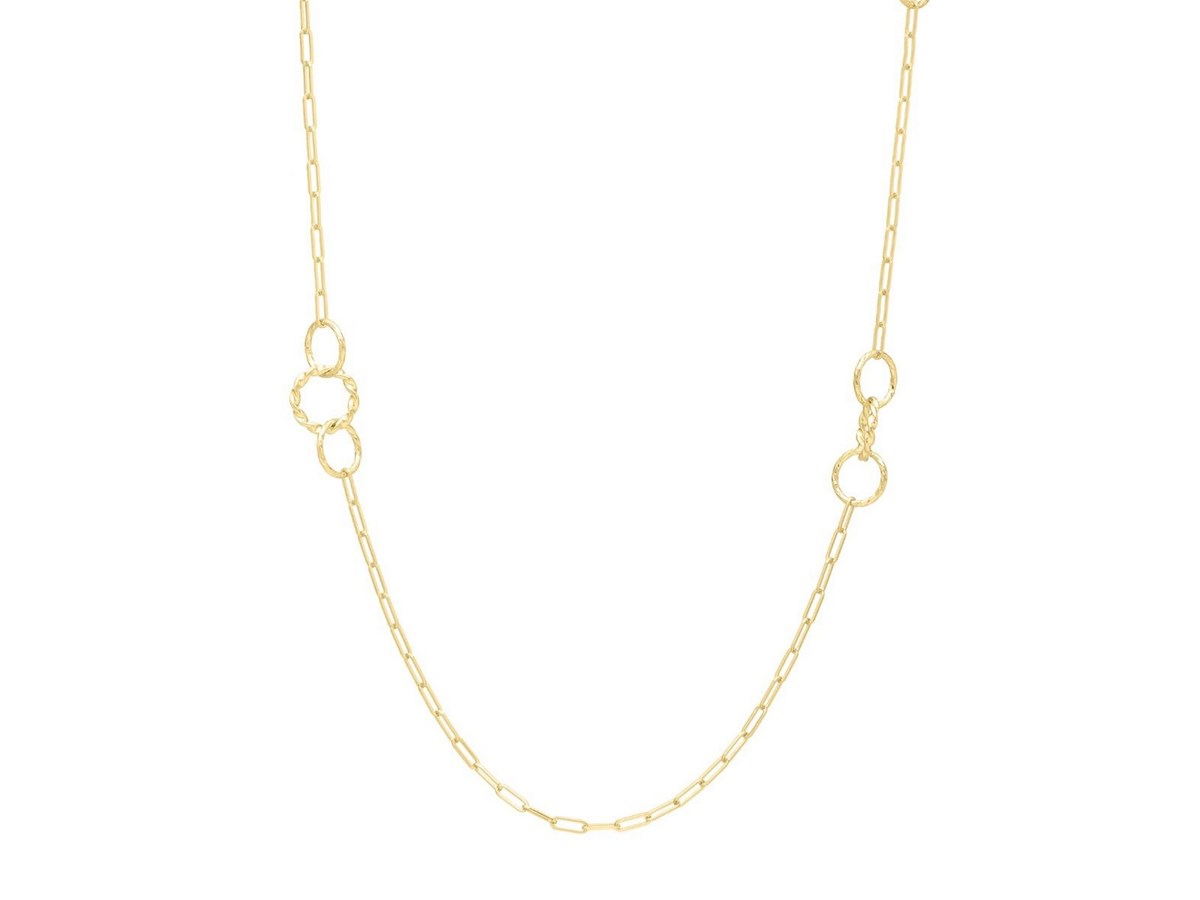 Embrace contemporary design with this 14k yellow gold link paperclip necklace, featuring six sets of stationed, textured circles that elegantly punctuate the sleek links. A perfect blend of bold geometry and refined detail, this piece adds a dynamic touch to any modern silhouette. Secured with a lobster clasp closure.