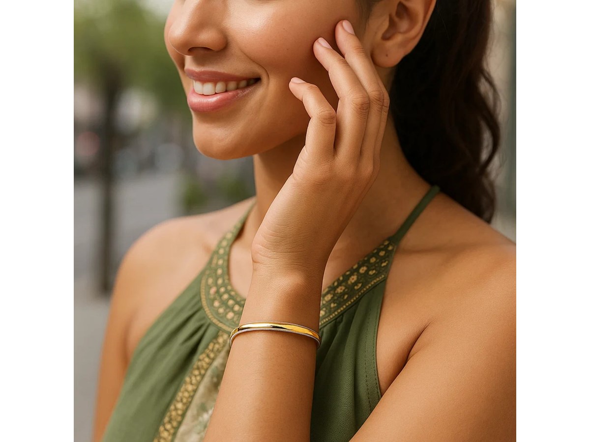 For those seeking a subtle touch, this exquisite two-tone bangle combines the timeless allure of 14k yellow gold with delicate silver edging, creating a striking contrast. The smooth polished surface radiates brilliantly, while the diamond-cut edging introduces an eye-catching sparkle. Thin and lightweight, this fancy bangle is designed for both comfort and style. Its understated sophistication allows it to be worn alone or layered with other pieces for a more dramatic effect.