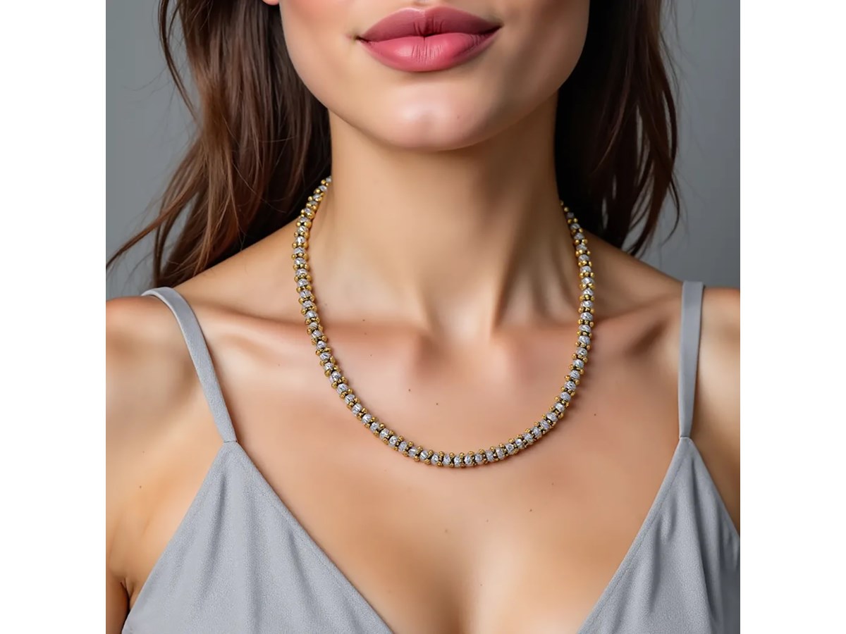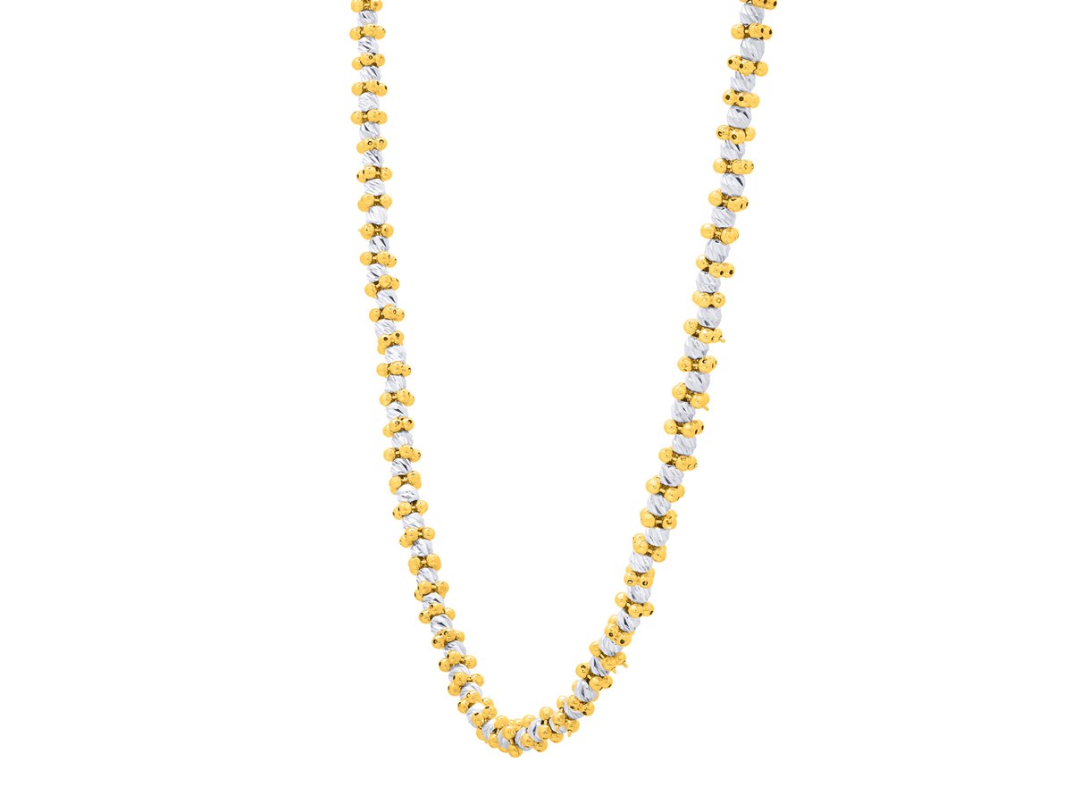 Delicate gold spacers set between textured silver beads define this 14K two-tone fancy chain necklace. A lobster clasp provides a secure fit, while the interplay of metals creates a balanced aesthetic. Designed for versatility, it offers a refined accent whether worn alone or layered with other pieces.