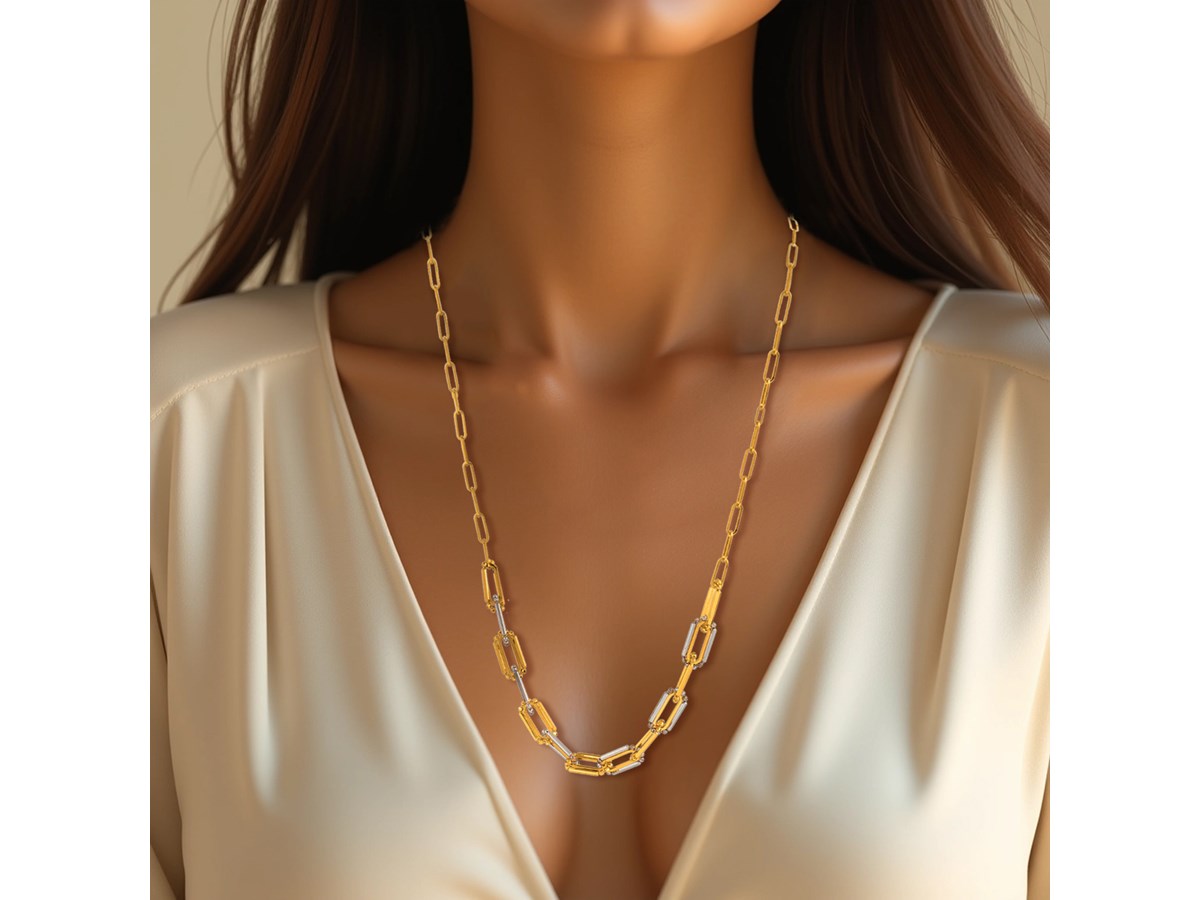 A striking blend of contrast and dimension, this 14k two-tone gold paperclip necklace offers a refined balance of texture and shine. Graduated paperclip links form a fluid, elegant design that leads to a captivating centerpiece—larger, two-tone embellished links that add depth and intrigue. Designed for versatility, the 18-inch length includes a jump ring at 16 inches for adjustable wear, while the lobster clasp ensures a secure fit.